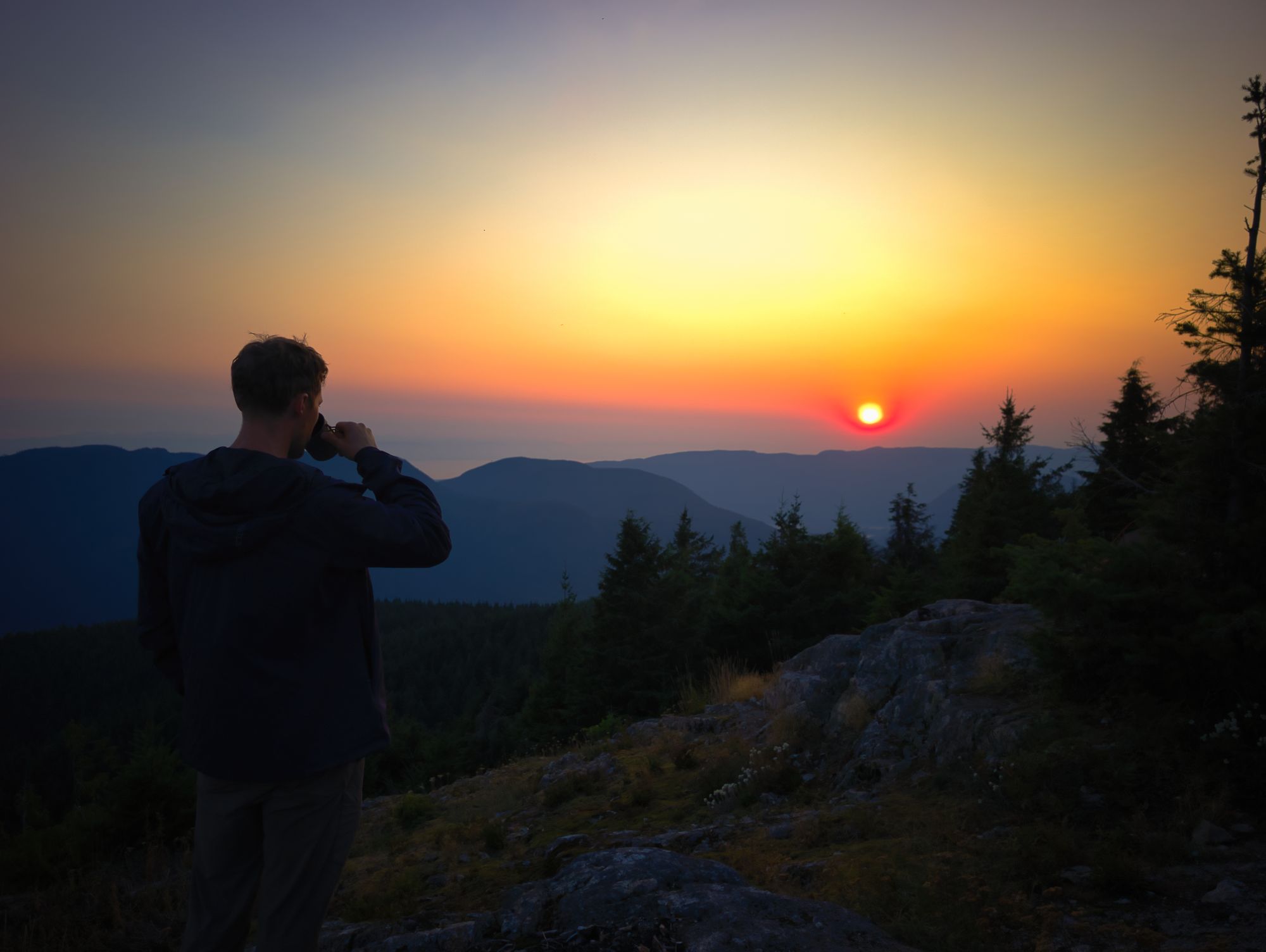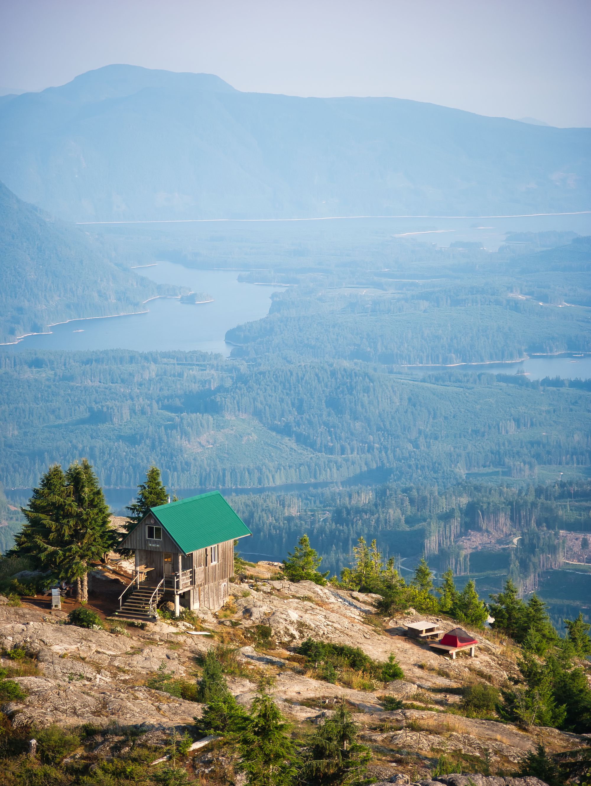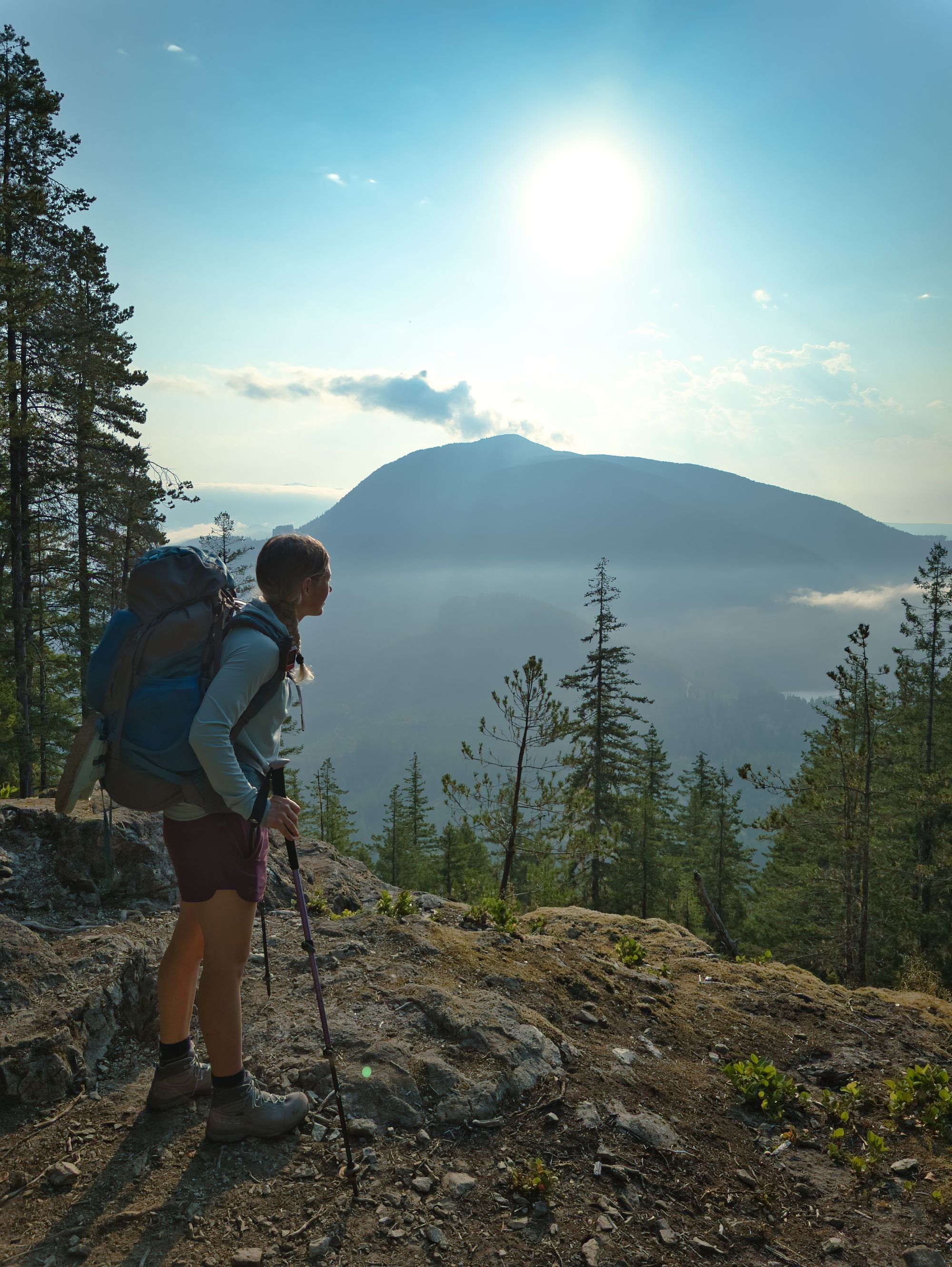 After dinner we hiked up to the summit for dessert – freeze-dried ice cream sandwiches, absolutely incredible – and to admire the views. The trail up from the hut is super short so we were up quick! Would definitely recommend wearing real shoes rather than camp sandals though, as it’s a bit scrambly in a couple parts. We met a solo hiker who'd set up a small tent on a flat spot near the top with a really fantastic view. We sat for a while, looking out over Powell Lake and the surrounding hills.