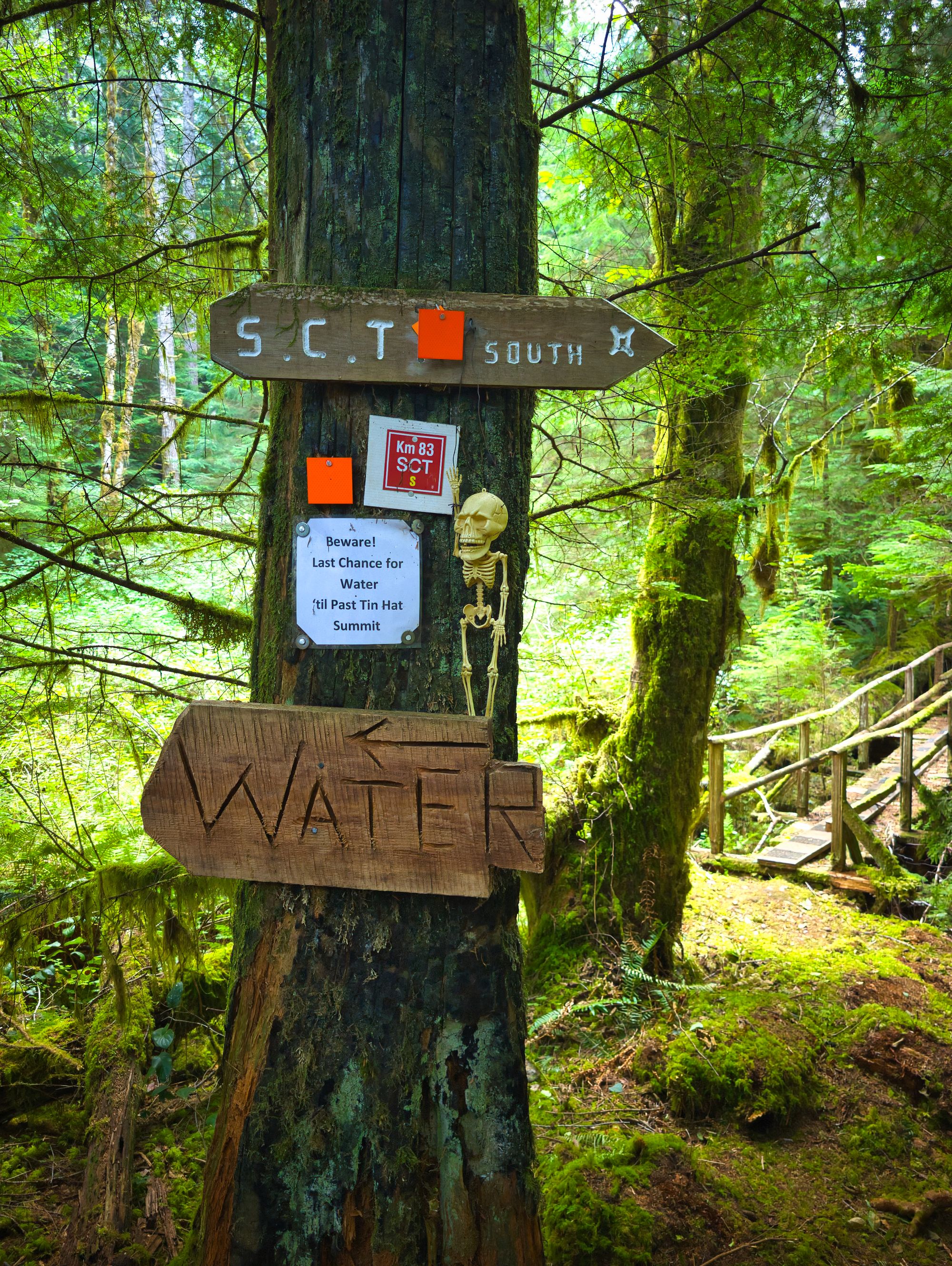 The sun broke through later in the afternoon as we continued our climb. We passed a couple small streams before arriving at the "last water" sign (at KM83) and stopped to fill up. We loaded our 10L MSR Dromedary full, shouldered our heavy packs and carried on.