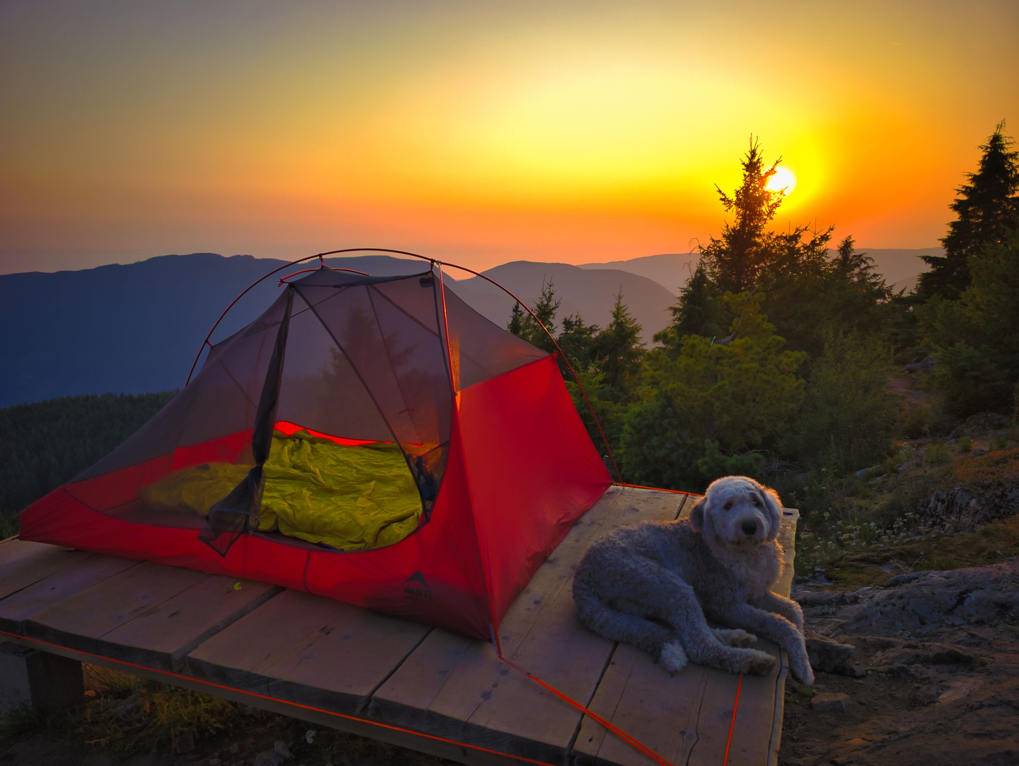 Our snoring friend from the previous night joined us at the hut area soon after, so we decided to set up our tent on the wooden pad overlooking Haslam Lake. We were also told by a local hiker that the hut is frequented by mice. Once camp was set up, we cooked a yummy meal and fed the dog.