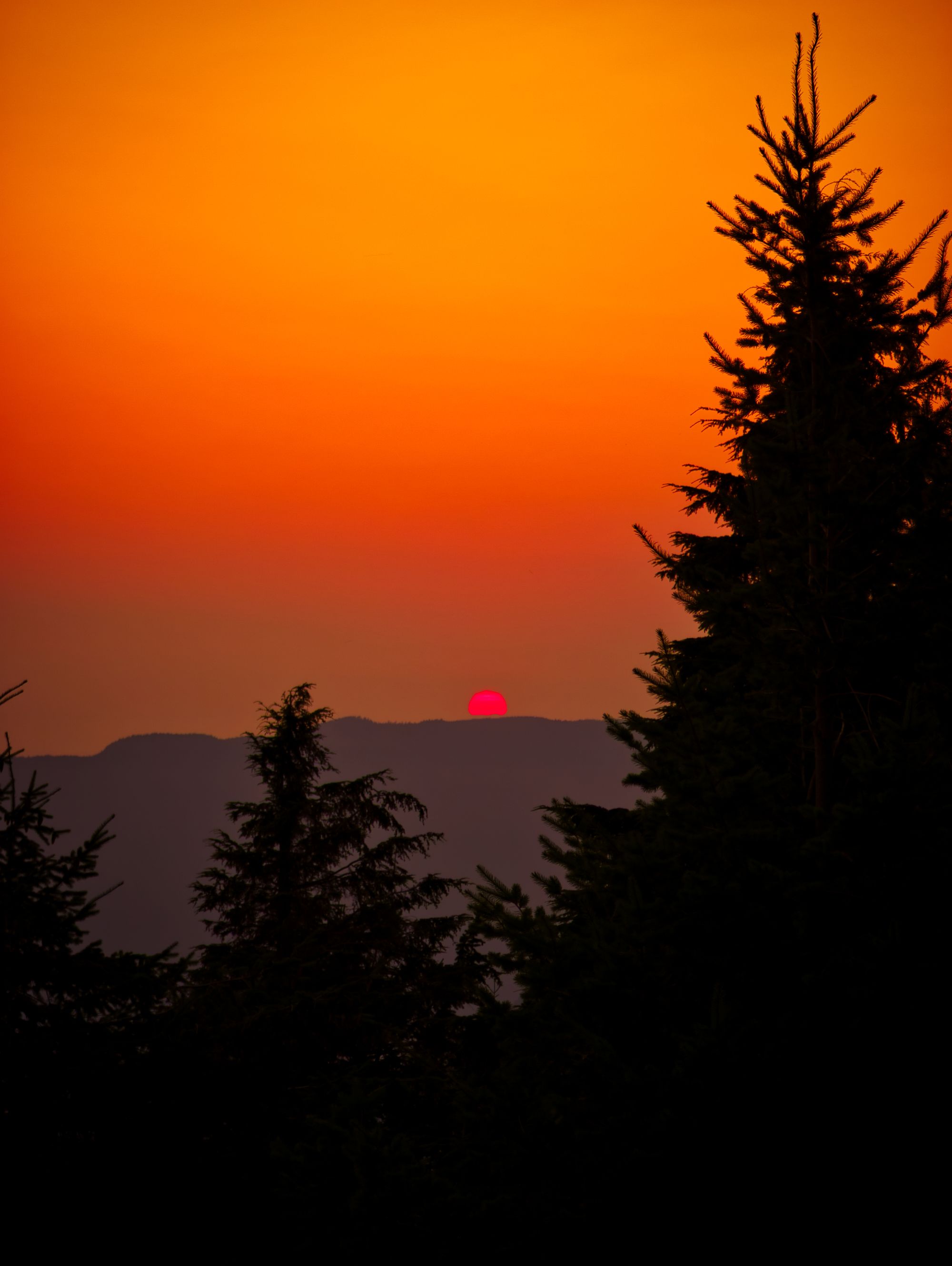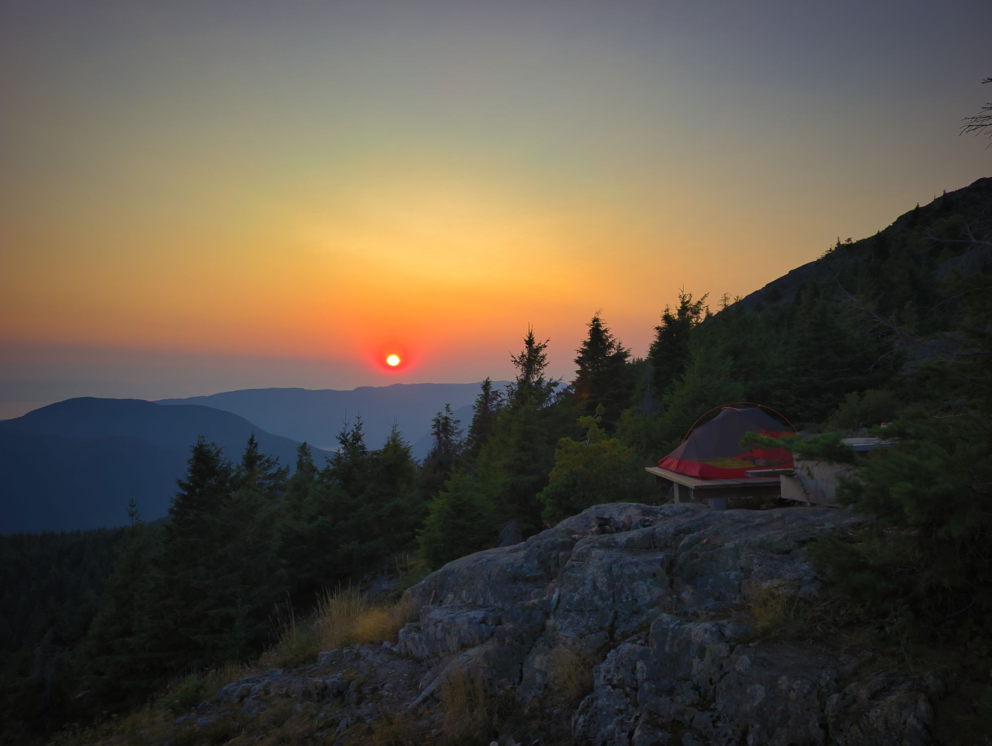 We came back down about an hour before sunset and watched the sun go down with the other hikers staying the night. It was an interesting sunset, the sun red and swollen as it cut through the smoke and haze. It slowly sank beyond the horizon, illuminating the island mountains in the distance as it disappeared from view.